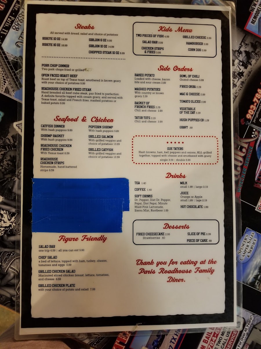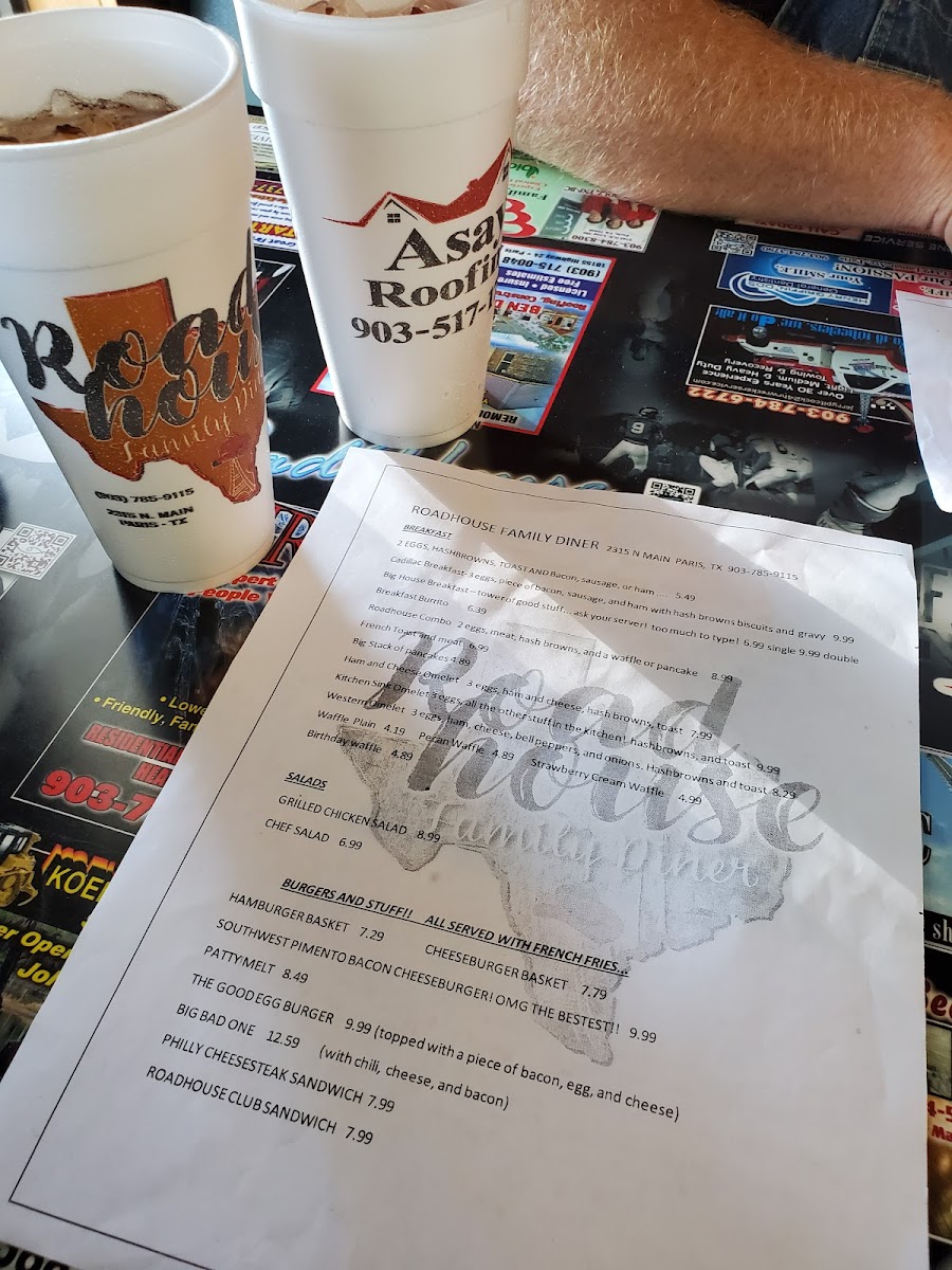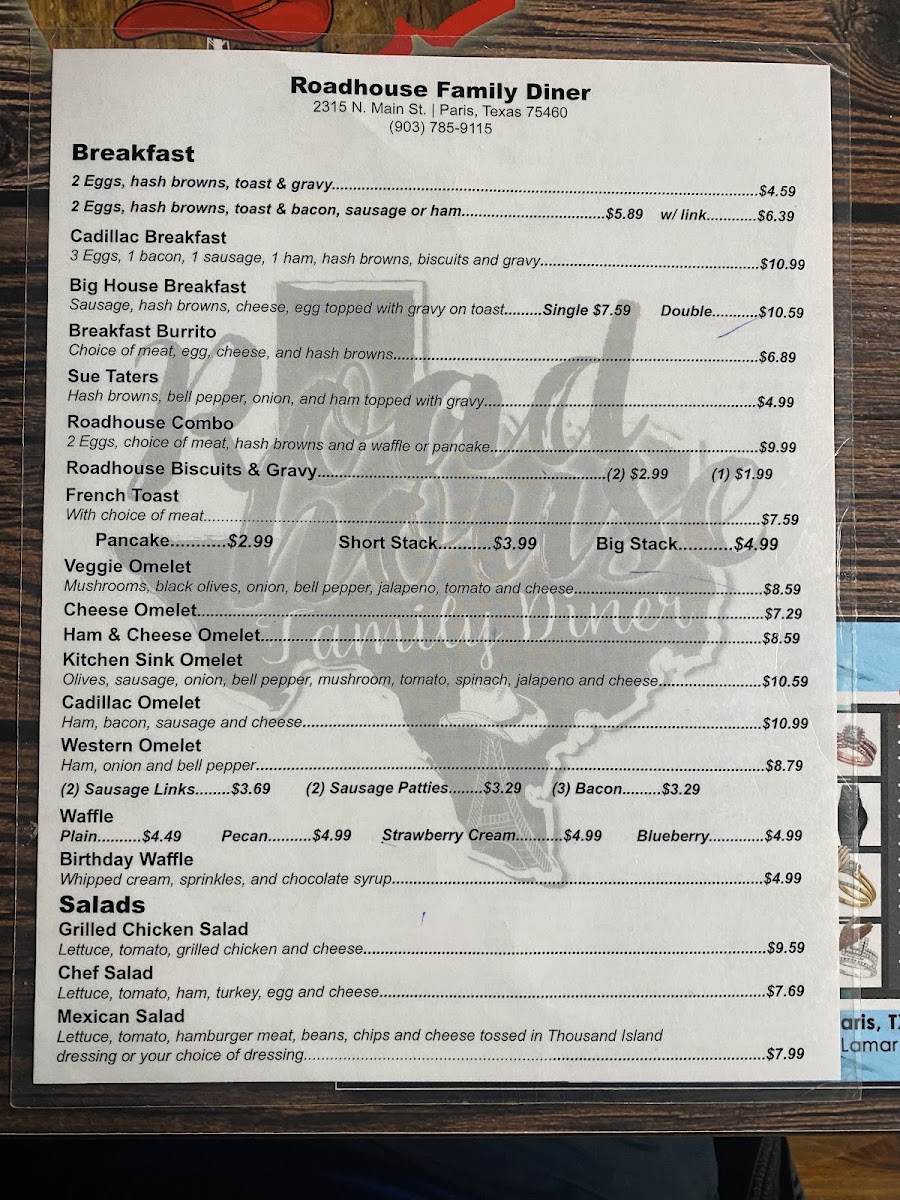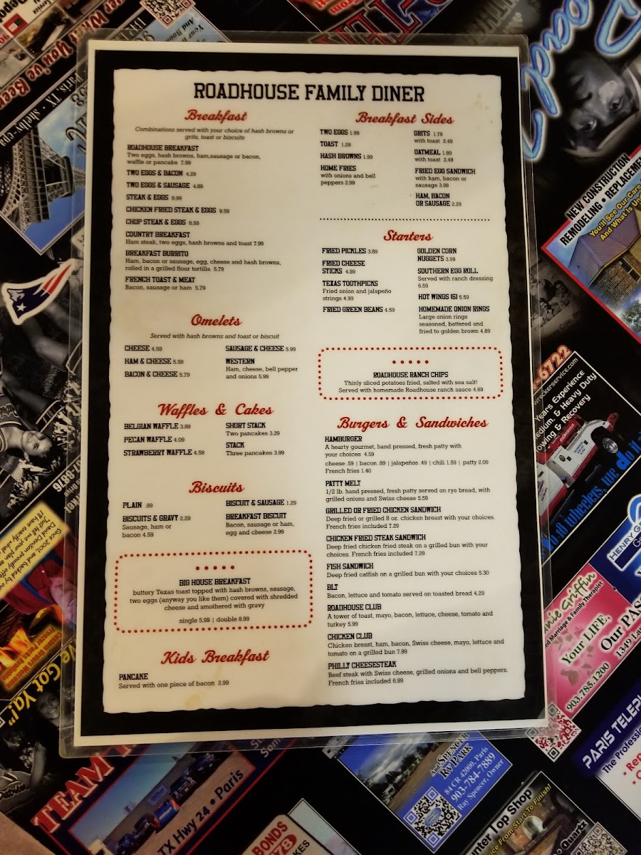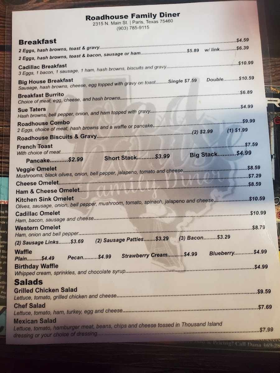 The Roadhouse Family Diner Menu offers a variety of comforting, home-style dishes perfect for any occasion. Located at 2315 N Main St, Paris, TX, this diner invites you to enjoy a casual and cozy dining experience with something for everyone. Whether you're in the mood for a hearty breakfast, a juicy burger, or a satisfying dinner, the menu has you covered. You can start your day with classic favorites like fluffy pancakes and scrambled eggs, or dive into a delicious steak or fresh salad for lunch. And don’t forget about the sides - the crispy fries and golden onion rings are a must-try! For dessert, indulge in homemade pies or a milkshake that brings back nostalgic memories. No matter what you choose, you'll feel right at home at the Roadhouse Family Diner.