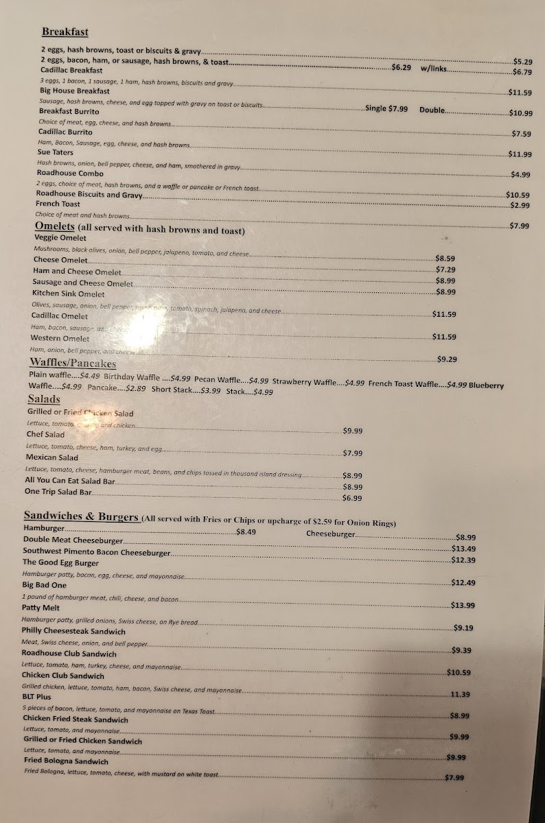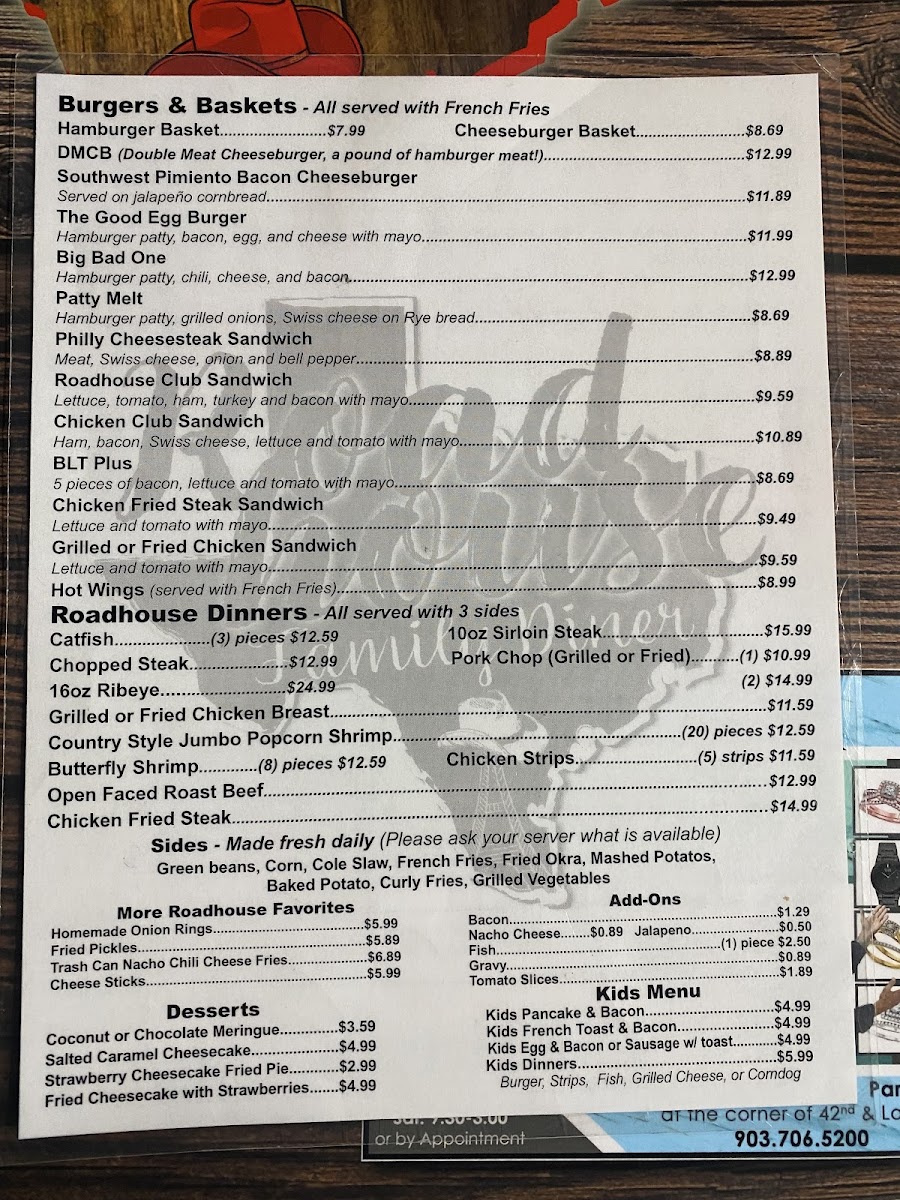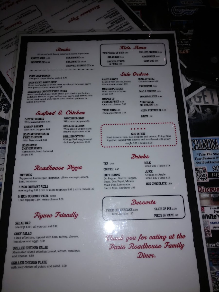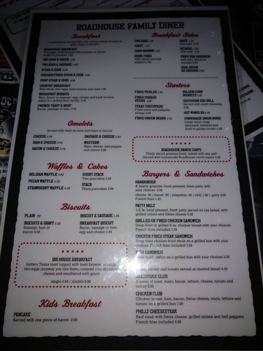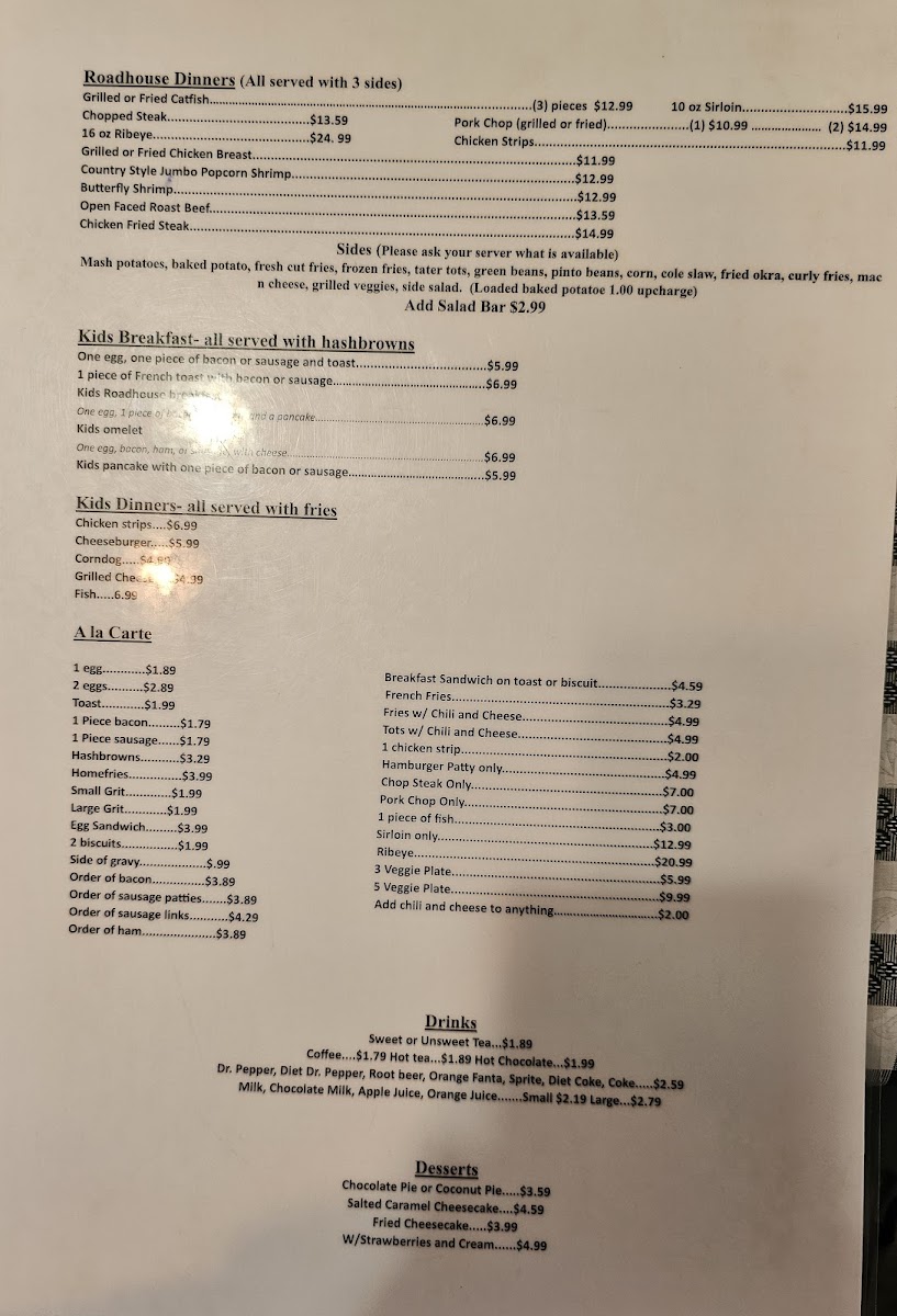 The Roadhouse Family Diner Menu offers a variety of comforting, home-style dishes perfect for any occasion. Located at 2315 N Main St, Paris, TX, this diner invites you to enjoy a casual and cozy dining experience with something for everyone. Whether you're in the mood for a hearty breakfast, a juicy burger, or a satisfying dinner, the menu has you covered. You can start your day with classic favorites like fluffy pancakes and scrambled eggs, or dive into a delicious steak or fresh salad for lunch. And don’t forget about the sides - the crispy fries and golden onion rings are a must-try! For dessert, indulge in homemade pies or a milkshake that brings back nostalgic memories. No matter what you choose, you'll feel right at home at the Roadhouse Family Diner.